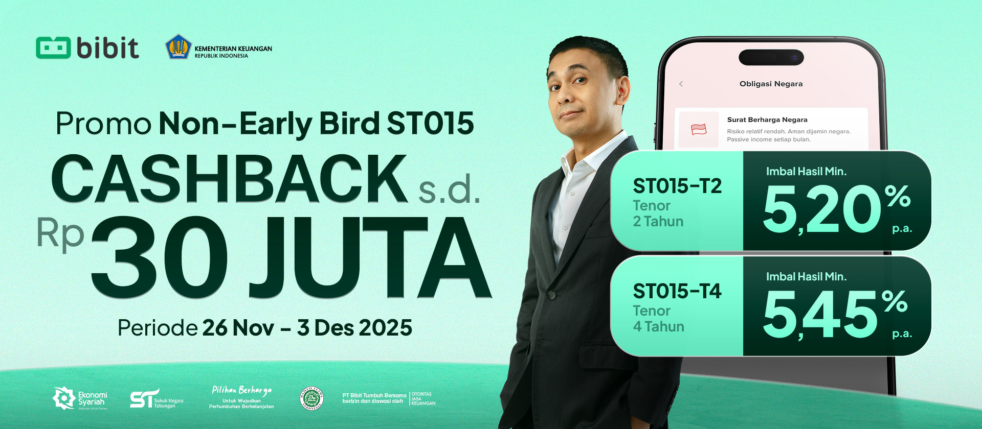SBN Sukuk Tabungan seri ST015 akan mengakhiri masa penawaran pada 3 Desember 2025 pukul 10.00 WIB. ST015 menawarkan floating with floor return yang masih bisa naik jika BI Rate naik tapi anti turun. Return cair tiap bulan tanggal 10 hingga jatuh tempo. Kuota terbatas! Walaupun ditambah menjadi Rp2 triliun, namun masih terus diborong dan kini tersisa 25% (per 24/11 pukul 15.00 WIB). Segera dapatkan minimum return 5,20% p.a.