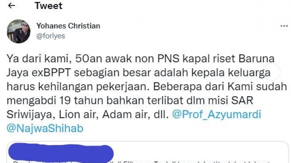 Sebanyak 50-an awak Kapal Riset Baruna Jaya milik Badan Pengkajian dan Penerapan Teknologi (BPPT) yang berstatus non-PNS diberhentikan dan tidak menerima pesangon.