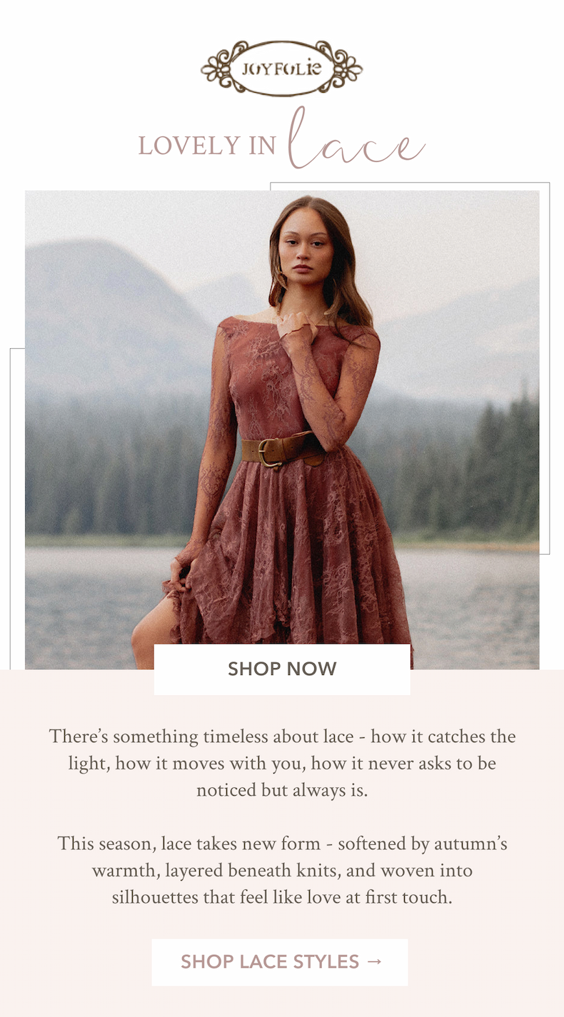 Delicate lace, warm tones, and silhouettes that feel like love at first touch. ͏ ͏ ͏ ͏ ͏ ͏ ͏ ͏ ͏ ͏ ͏ ͏ ͏ ͏ ͏ ͏ ͏ ͏ ...