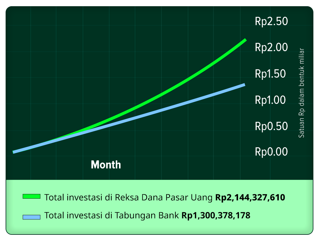 Satuan Rp dalam bentuk miliar. Simulasi berdasarkan historis return Top Reksa Dana Pasar Uang sebesar 5,5% per tahun tabungan bank sebesar 1% per tahun yang sudah dipotong pajak. |