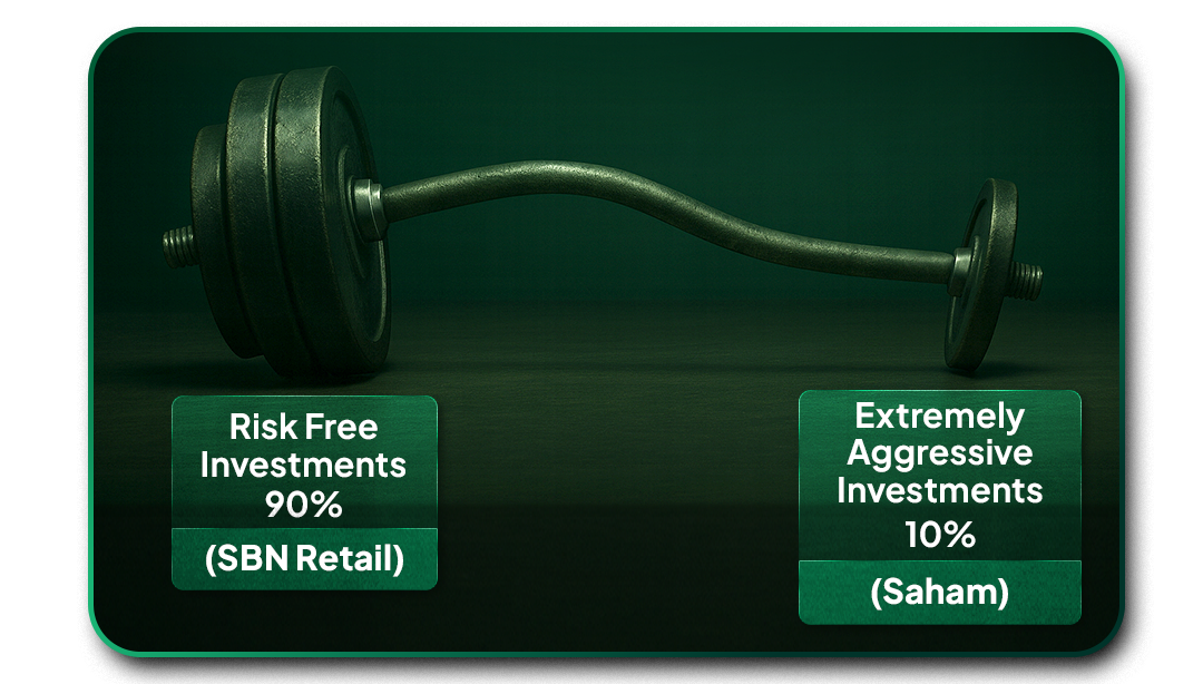 Barbell Strategy adalah salah satu strategi investasi yang lebih pasif. Strategi ini mengalokasikan aset pada dua ekstrem spektrum risiko (konservatif dan agresif). Contohnya sebagai berikut: |