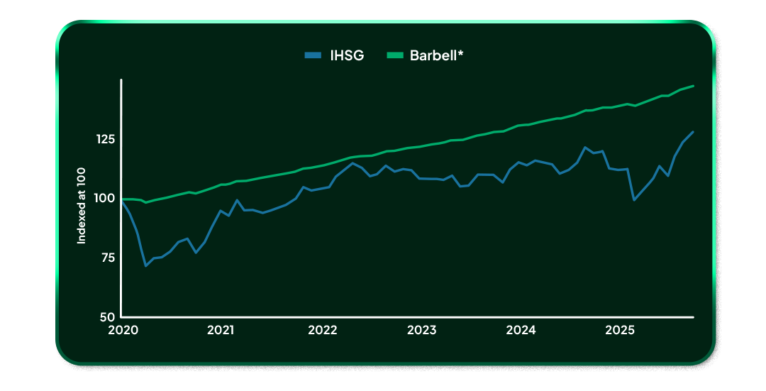 *Barbell Strategy consists of 10% JCI Index and 90% 10Y Indonesia Government Bonds with yield as of 2019. Data historis, tidak menjamin kinerja masa depan. |
