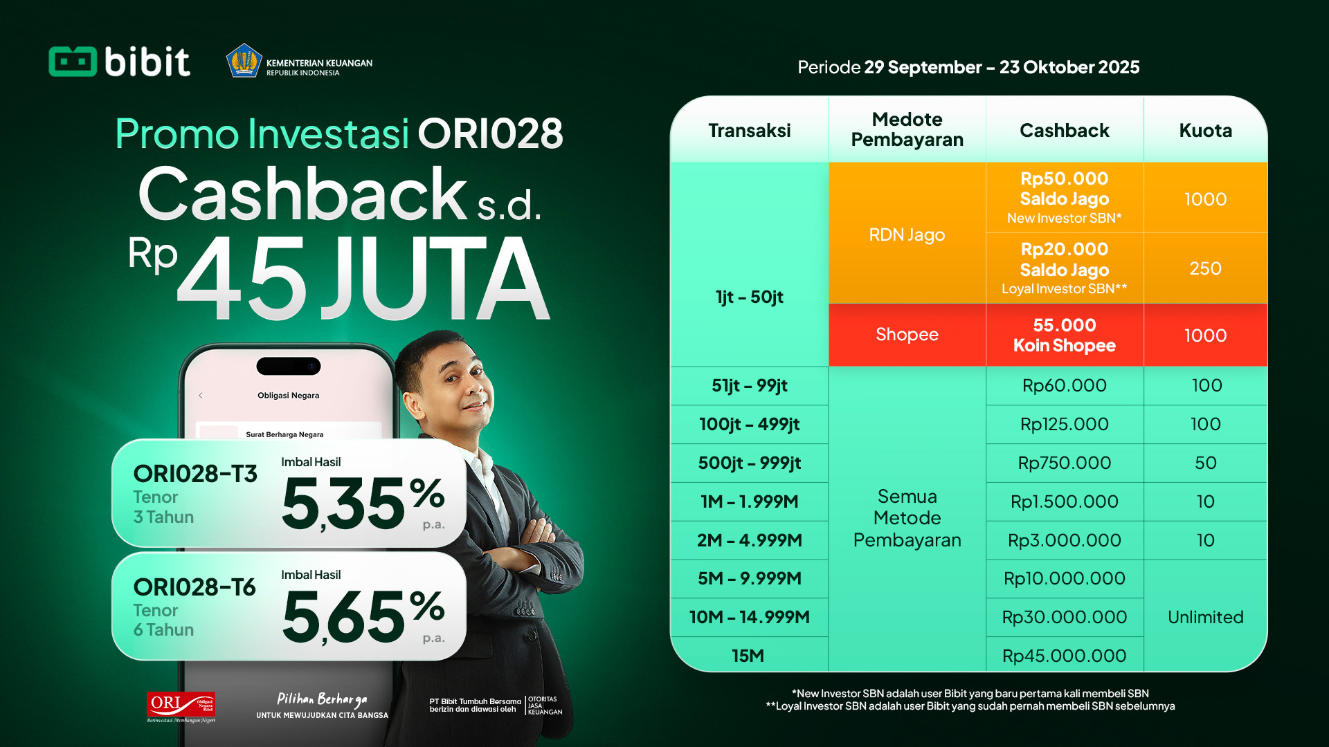INVESTASI ORI028 MASIH ADA CASHBACK HINGGA Rp45 JUTA DARI BIBIT |