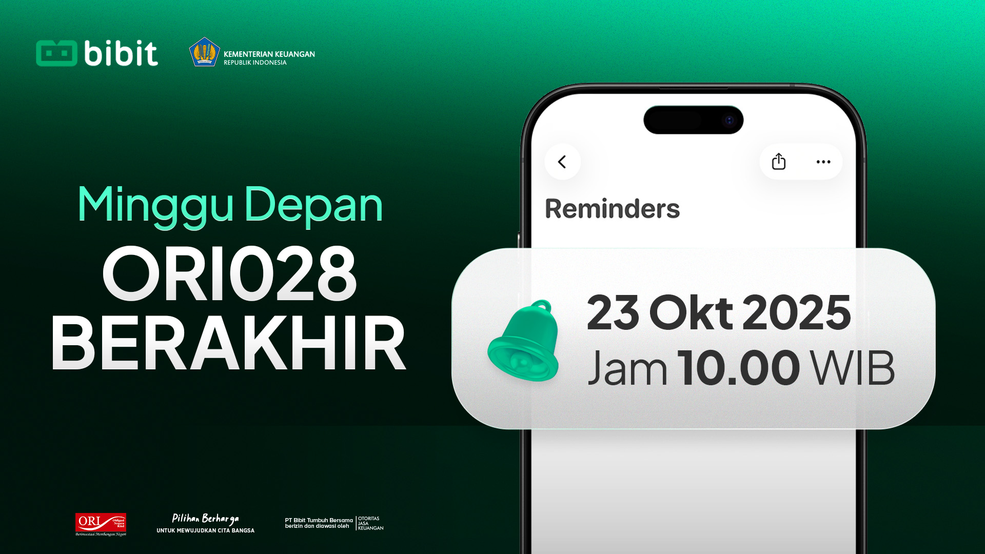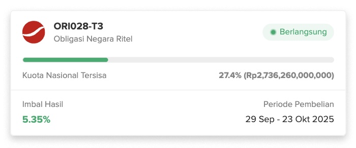 Segera amankan kuota ORI028 yang bisa dibeli di Bibit. ORI028 mengakhiri masa penawaran minggu depan, 23 Oktober 2025 pukul 10.00 WIB. Per 17 Oktober pukul 13.00 WIB, kuota ORI028-T3 tersisa <30% dan menjadi favorit para investor karena tenornya yang lebih pendek.