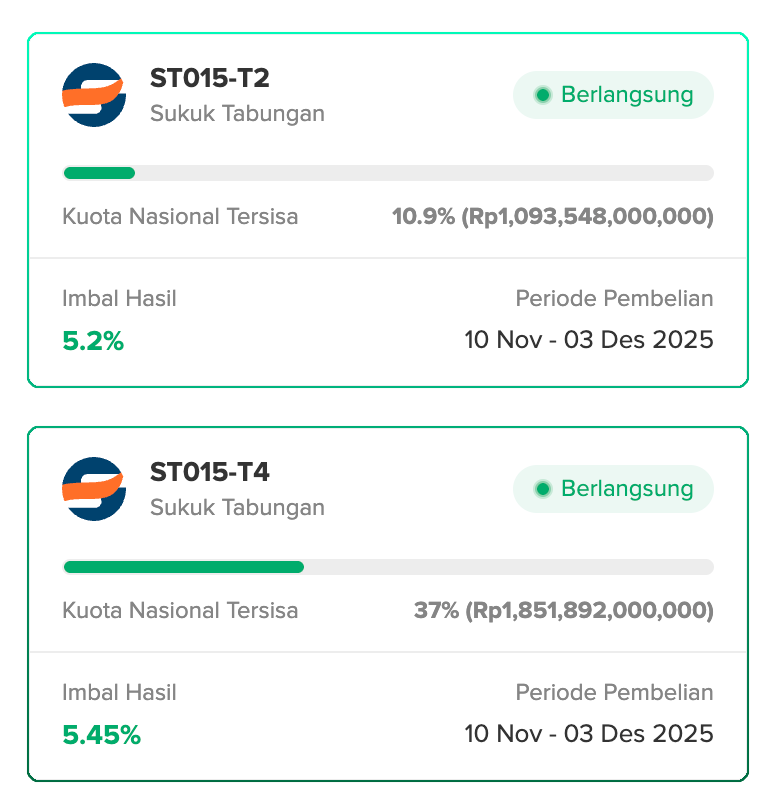 SBN terakhir tahun ini yaitu ST015 masih dalam masa penawaran hingga 3 Desember 2025 pukul 10.00 WIB. Minat investor terhadap ST015 cukup tinggi, terlihat dari kuota yang terus menipis meskipun sudah ditambah. |