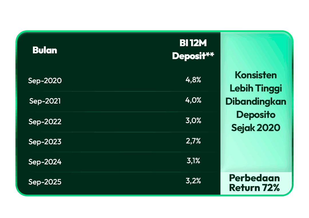 *Rata-rata return Top Reksa Dana Pasar Uang di Bibit per 10 November 2025. **Rata-rata deposito berdasarkan data suku bunga deposito 12 bulan historis setelah dipotong pajak 20%. Sumber: Bloomberg. |