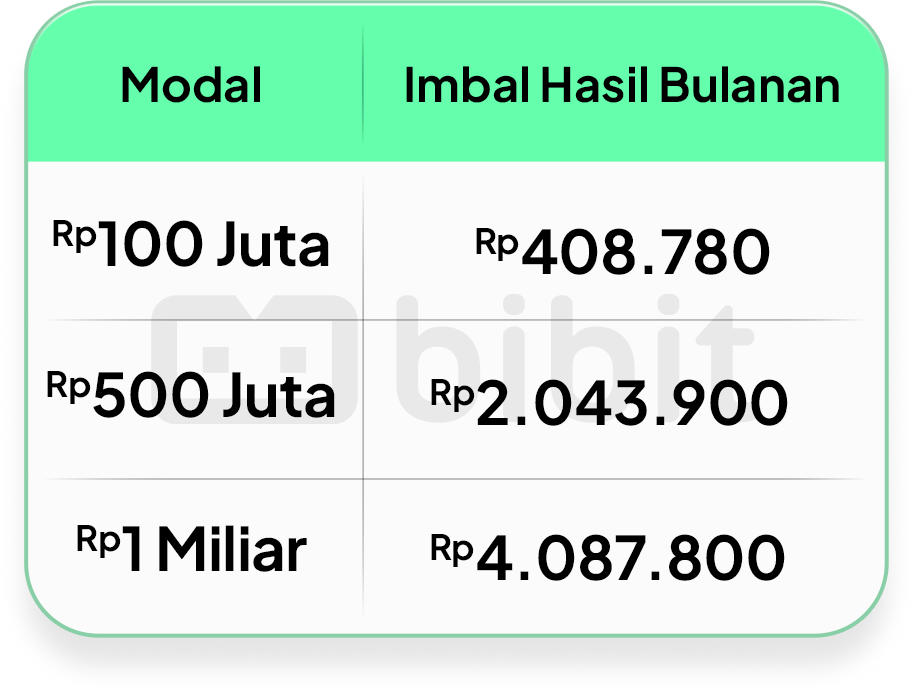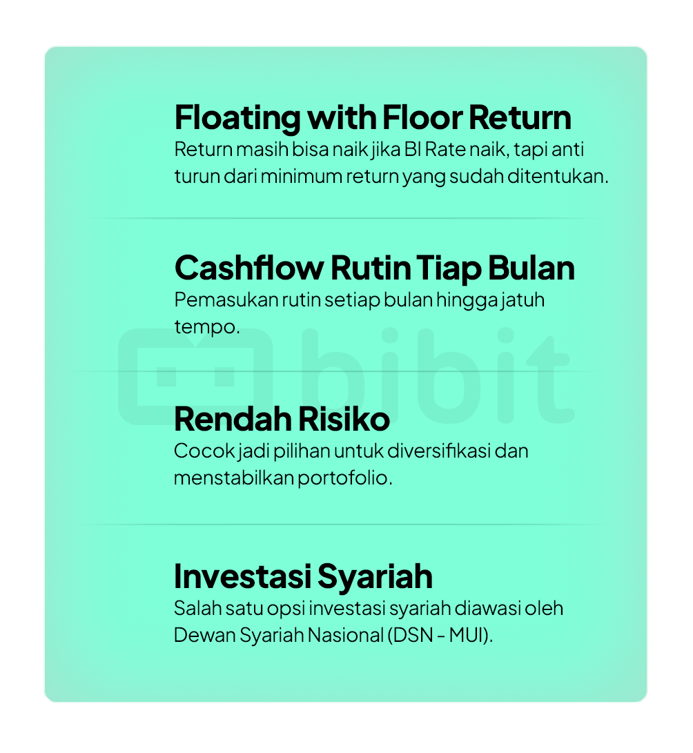 Dapatkan tambahan cash flow rutin bulanan dengan minimum return 5,20% p.a. Masih bisa naik jika BI Rate naik, tapi anti turun!