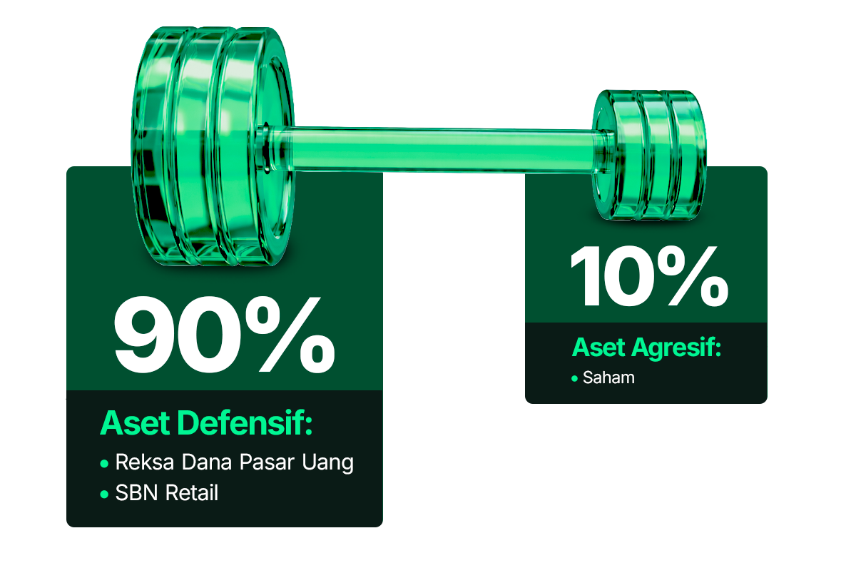| | Aset Defensif untuk Kontrol Risiko Menjaga dana tetap stabil dari pergerakan pasar yang volatil. | | | Aset Agresif untuk Potensi Pertumbuhan Memberi potensi imbal hasil lebih tinggi dalam jangka panjang. | | |