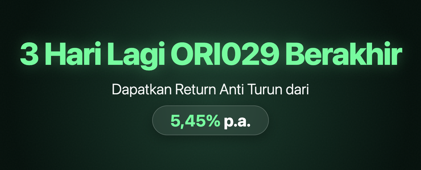 | Kesempatan terakhir dapatkan return anti turun ORI029 sebelum 19 Februari, pukul 10.00 WIB. | ⚠️ Kuota ORI029-T3 Menipis, Tersisa <45% | | | | ORI029-T3 Obligasi Negara Ritel | | | Sisa Kuota Nasional | 43.5% (Rp6,95T) | | Imbal Hasil 5.45% p.a Tenor 3 Tahun | | | | | |