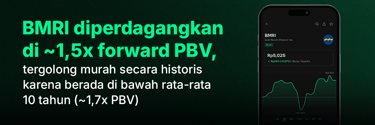 | | Saham perbankan umumnya dinilai menggunakan Price-to-Book Value (PBV). Per 6 Februari 2026, BMRI diperdagangkan di ~1,5x forward PBV. Level ini tergolong murah secara historis karena berada di bawah rata-rata (mean) historisnya selama 10 tahun, yakni ~1,7x PBV. | | | Valuasi ini juga tergolong murah dengan potensi dividend yield 7,6–8,1% per tahun. Secara historis, BMRI konsisten membagikan dividen selama 18 tahun berturut-turut (tahun buku 2008-2024). Berdasarkan estimasi konsensus, BMRI diproyeksikan menghasilkan laba per saham sebesar Rp587,7 dari tahun buku 2026. Dengan asumsi rasio pembagian dividen sebesar 65–70%, potensi dividen tahun buku 2026 adalah Rp382–411 per saham. Pada harga Rp5.050 (per 6 Februari 2026), potensi dividend yield mencapai 7,6–8,1% per tahun. | | | Meskipun rasio pembagian dividen BMRI tidak pernah lebih rendah dari 60% dalam 5 tahun terakhir (tahun buku 2020-2024), rasio kecukupan modal (Capital Adequacy Ratio) tetap bertahan di atas level 19%. Hal ini menunjukkan kapasitas BMRI untuk tetap membagikan dividen minimal 60% tanpa mengganggu permodalan untuk bertumbuh. | | |