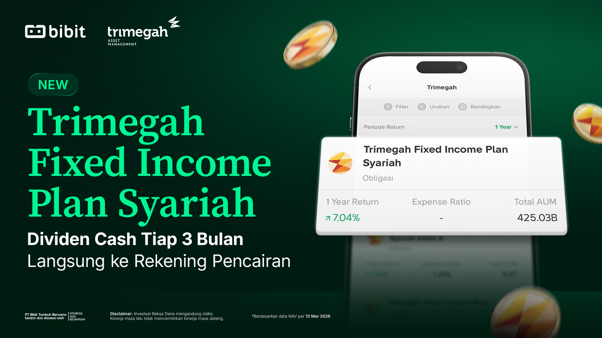 | | Dividen dibagikan setiap 3 bulan sekali dalam bentuk cash yang dikirim langsung ke rekening pencairan yang terdaftar di Bibit. | | | Berdasarkan fund fact sheet Februari 2026, total return Trimegah Fixed Income Plan Syariah konsisten lebih tinggi dari tolok ukurnya yaitu deposito 6 bulan (IDRE6MO) sejak diluncurkan Mei 2023. | | |