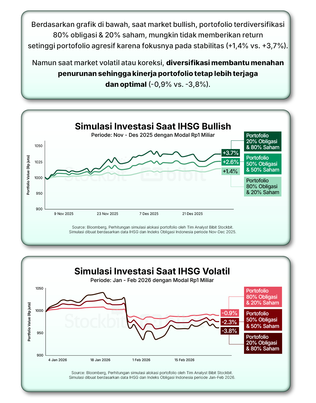 Berdasarkan data IHSG, diversifikasi investasi terbukti menjadi "penyelamat" portofolio saat IHSG bergerak volatil. Berikut adalah simulasi pergerakan portofolio dengan modal Rp1 Miliar di berbagai alokasi diversifikasi.